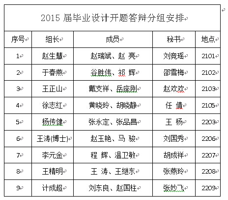3. 請(qǐng)各位指導(dǎo)教師認(rèn)真指導(dǎo)學(xué)生,并通知學(xué)生到指導(dǎo)教師所在的組進(jìn)行開題,學(xué)生開題安排見附件1:2015屆畢業(yè)生開題答辯安排表。