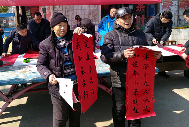 活動現場,5位教師現場揮毫,為村民們免費書寫并贈送春聯,為他們送上新春的美好祝福。“沐浴十九大春風,加速奔小康進程”、“萬眾一心打好脫貧攻堅戰(zhàn),千方百計引導精準致富路”、“定遠風光好,義和氣象新”等一幅幅飽含村民新年祈愿的春聯躍然紙上。
