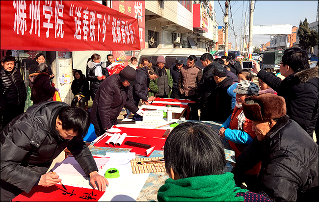 定遠縣大橋鎮(zhèn)宣傳委員何高鳳對我校“送春聯”活動表示感謝。她說,“送春聯”活動不僅豐富了村民文化生活,也是滁州學院落實與定點幫扶村結對幫扶工作的一次具體實踐,對繁榮幫扶村文化、促進定點精準扶貧,起到了積極的作用。