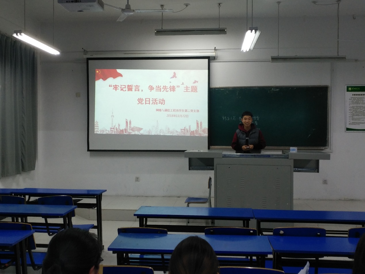 11月22日,網絡與通信工程系學生第二黨支部在YF1106教室舉辦了“牢記誓言,爭當先鋒”的主題黨日活動,全體支部在校黨員參加了此次活動,獲此活動由陳波波同志主持。