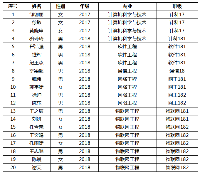 經(jīng)同學(xué)個(gè)人申報(bào)、班主任推薦、5月20日學(xué)院評(píng)審小組審核,擬定以下20位同學(xué)具備信息學(xué)院2019年暑期赴臺(tái)小學(xué)期實(shí)踐教學(xué)資格,現(xiàn)予以公示。