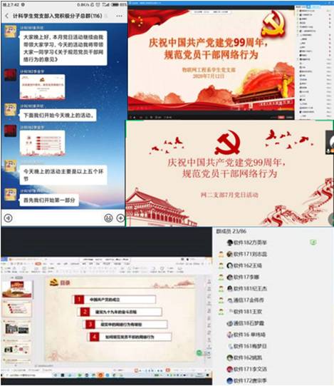 活動過程中,計算機工程系學(xué)生黨支部學(xué)生在入黨積極分子微信群一起學(xué)習(xí)《關(guān)于規(guī)范黨員干部網(wǎng)絡(luò)行為的意見》,觀看了《規(guī)范黨員干部網(wǎng)絡(luò)行為》動畫視頻,并圍繞活動主題進行了熱烈的發(fā)言。網(wǎng)絡(luò)與通信工程系學(xué)生第一黨支部的同學(xué)們回顧了中國共產(chǎn)黨建黨九十九周年的奮斗歷程,積極發(fā)言,對如何做到規(guī)范黨員干部網(wǎng)絡(luò)行為提出了自己的意見和建議。網(wǎng)絡(luò)與通信工程系學(xué)生第二黨支部的同學(xué)學(xué)習(xí)了《黨員必須牢記的廉潔紀律》《黨員必須牢記的政治紀律》中的相關(guān)內(nèi)容。物聯(lián)網(wǎng)工程系學(xué)生黨支部學(xué)生黨員在學(xué)習(xí)《關(guān)于規(guī)范黨員干部網(wǎng)絡(luò)行為的意見》相關(guān)精神后觀看了“建黨99周年影片”和“如何規(guī)范黨員干部網(wǎng)絡(luò)行為”兩個視頻資料,并就學(xué)習(xí)內(nèi)容進行了線上交流。