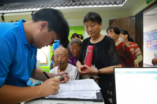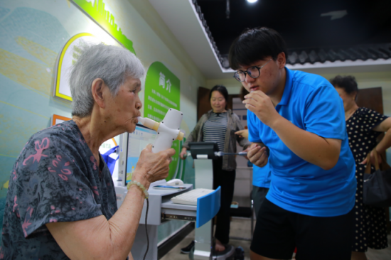 近日,安徽滁州市瑯琊區(qū)龍池社區(qū),老年朋友們?nèi)齼蓛上嗉s來到社區(qū)黨群活動(dòng)中心,檢測(cè)身體健康指標(biāo)。這是滁州學(xué)院師生利用暑期社會(huì)實(shí)踐專門為社區(qū)老人開展的智慧養(yǎng)老健康檢測(cè)公益服務(wù)活動(dòng)。