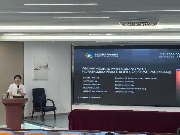 活動(dòng)周第二天是科研活動(dòng)專場,魏明強(qiáng)教授以“大模型激活新質(zhì)生產(chǎn)力發(fā)展強(qiáng)引擎”為主題開啟了科研活動(dòng)周的序幕,分享了現(xiàn)階段人工智能、大模型前沿進(jìn)展。黃佳維博士以“利用可歸一化的各向異性球面高斯模型實(shí)現(xiàn)物理渲染中的在線神經(jīng)網(wǎng)絡(luò)路徑引導(dǎo)”為題,分享了他近期在圖形學(xué)頂級(jí)會(huì)議報(bào)告的最新進(jìn)展。
