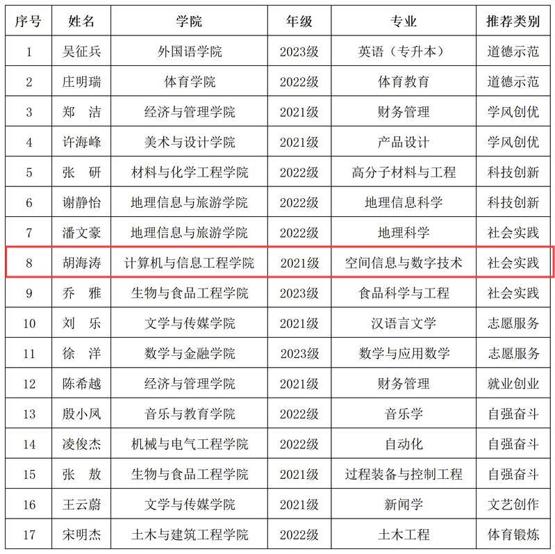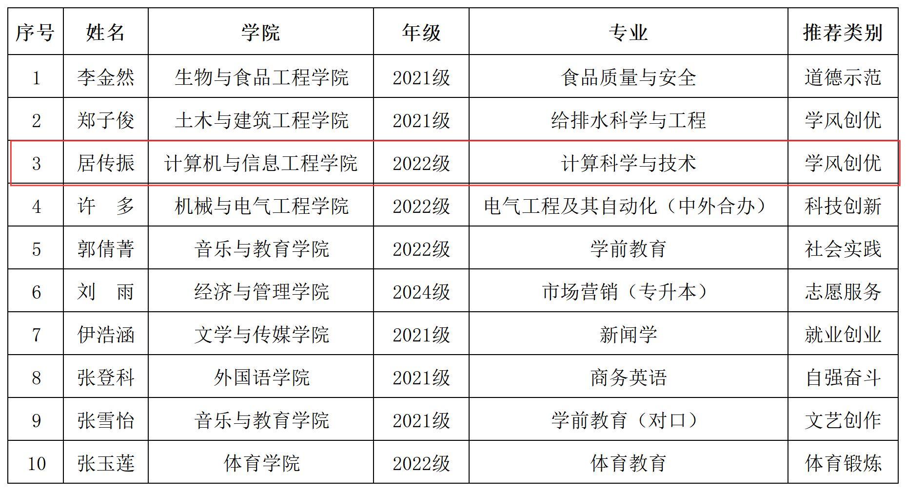近日,滁州學(xué)院關(guān)于公布2025年“十佳大學(xué)生”與“十佳大學(xué)生提名人選”評(píng)選結(jié)果,信息學(xué)院計(jì)科221居傳振入選滁州學(xué)院2025年“十佳大學(xué)生”名單,空間21胡海濤入選滁州學(xué)院2024年“十佳大學(xué)生提名人選”名單。